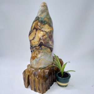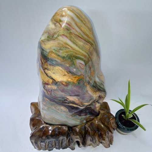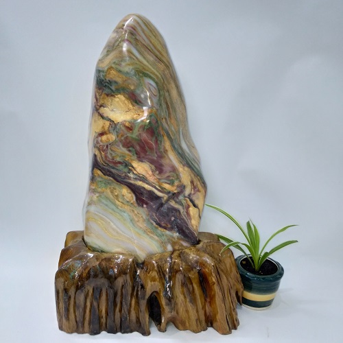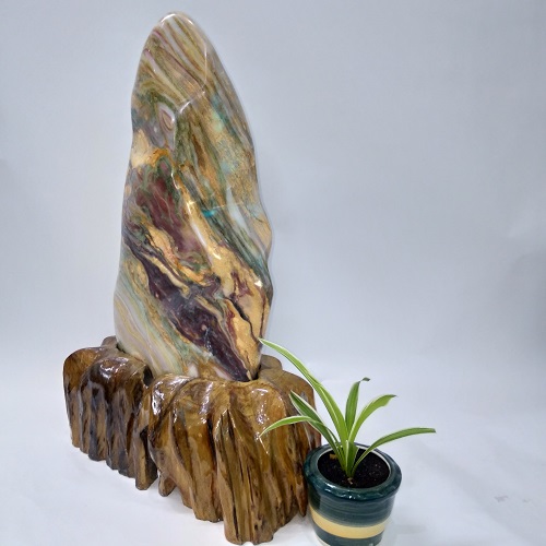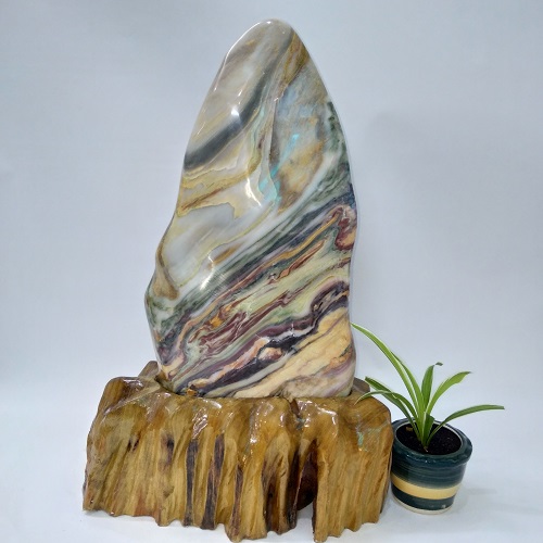 Đá phong thủy đá Serpentine ngũ sắc có dáng cao, cân đối, đặt trên một đế gỗ lũa tự nhiên. Đế gỗ được sơn phủ bóng, không mối mọt, ẩm mốc. Sản phẩm màu ngũ sắc nên hợp với tất cả các mệnh.