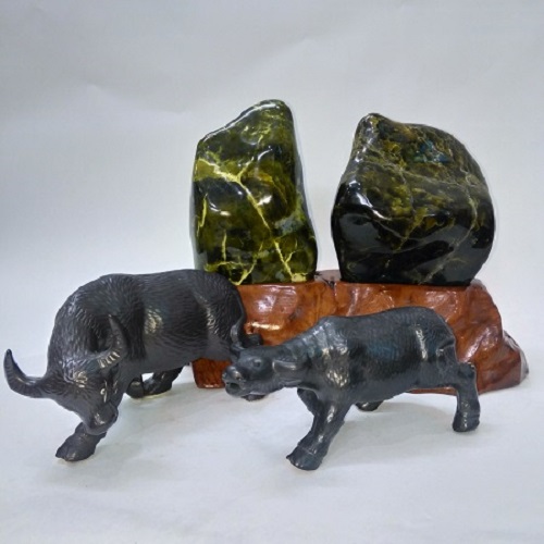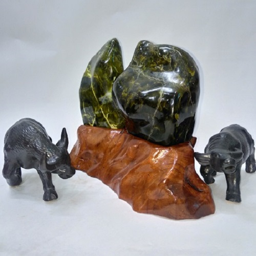 Đá phong thủy hòn trống mái (MS: HTM001) là sản phẩm đá tự nhiên nguyên khối 100%. Nó có tên gọi là Ngọc Serpentine.