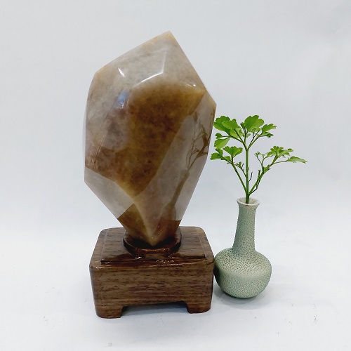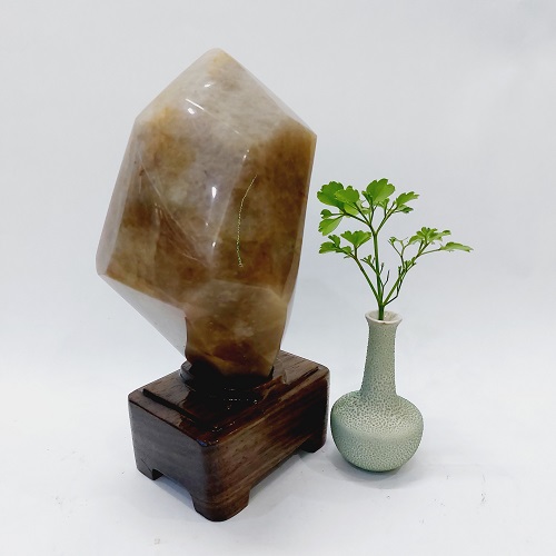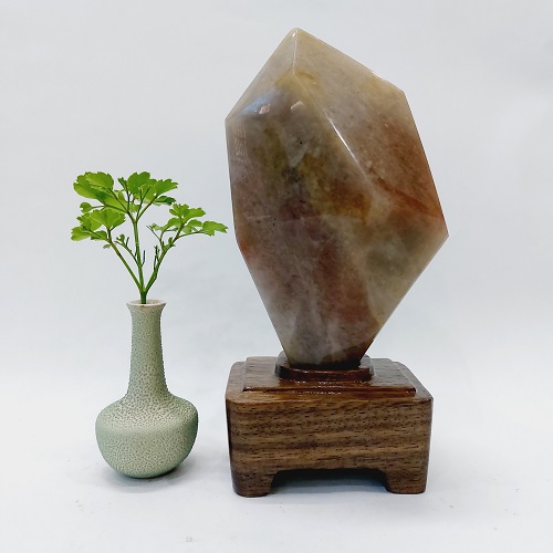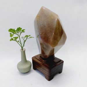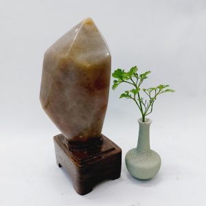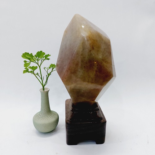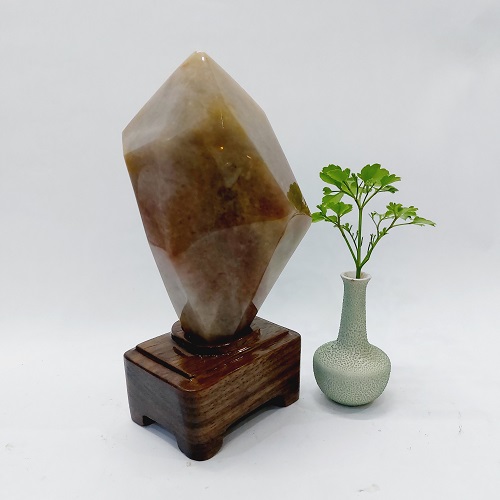Sản phẩm là một viên đá mã não màu đỏ vàng tự nhiên. Có dáng đẹp, hình chóp lục giác và thấu quang mạnh. Nó được đặt trên một đế gỗ tự nhiên, được gia công tỷ mỹ, không bị mối mọt, ẩm mốc.