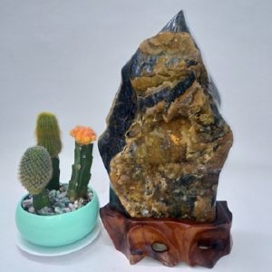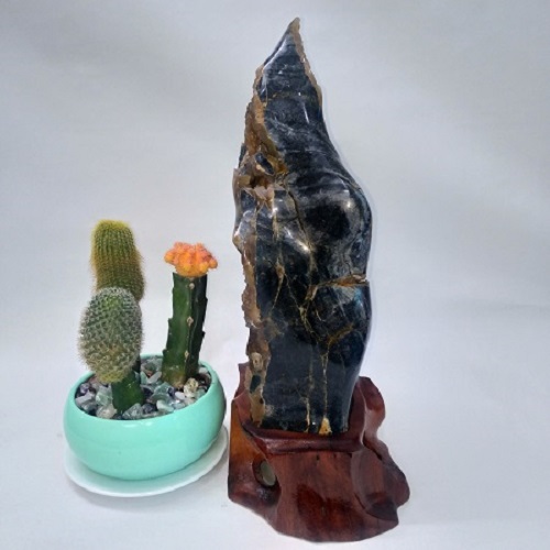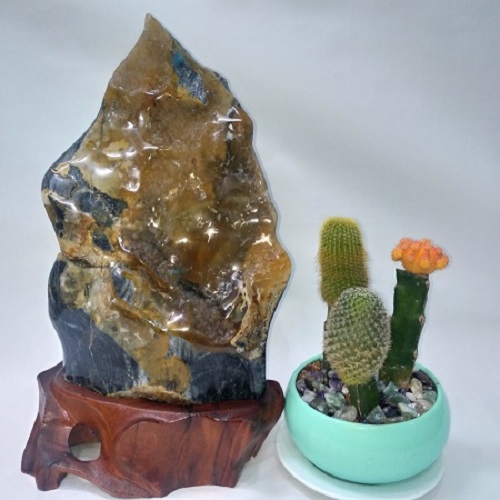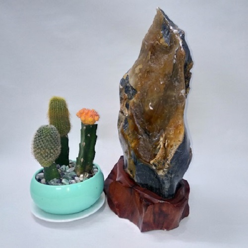 Đá đặt trên một đế gỗ lũa tự nhiên. Đế gỗ được sơn phủ bóng, không mối mọt, ẩm mốc. Sản phẩm có màu vàng mật ong nên sẽ hợp với người mệnh Thổ và Kim hoặc Hỏa
