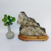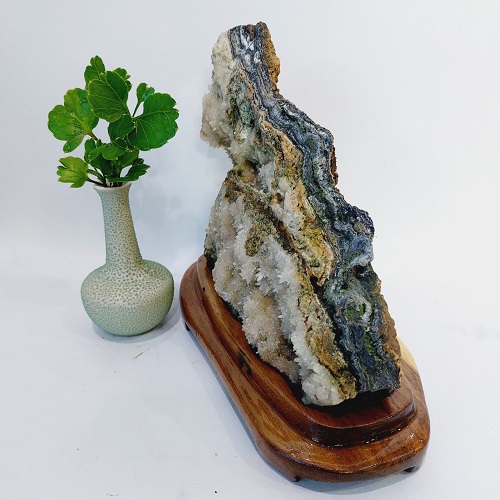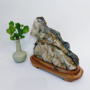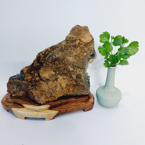 Đá đặt trên một đế gỗ lũa tự nhiên, chế tác tỉ mỉ. Đế gỗ được sơn phủ bóng, không mối mọt, ẩm mốc. Sản phẩm có màu trắng ngà.