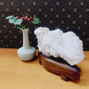 Sản phẩm là một bụi gồm nhiều tinh thể thạch anh trắng hình chóp lục giác. Nó được đặt trên một đế gỗ tự nhiên chế tác tinh xảo và nghệ thuật. Đế được phun pu phủ bóng, không bị mối mọt, ẩm mốc, nó càng làm tăng thêm vẻ đẹp cho viên đá.