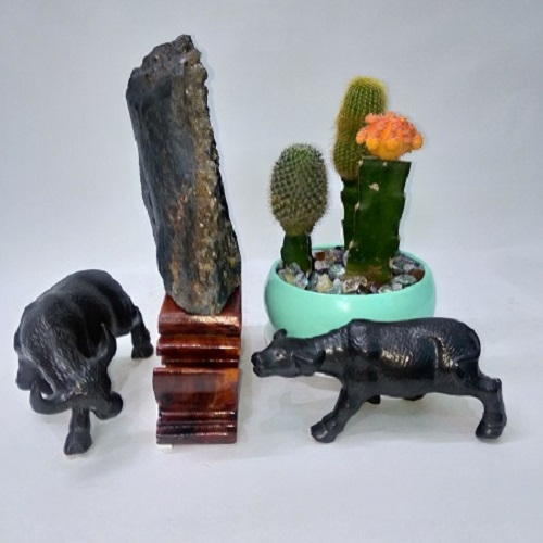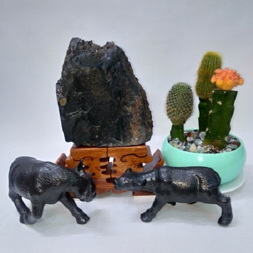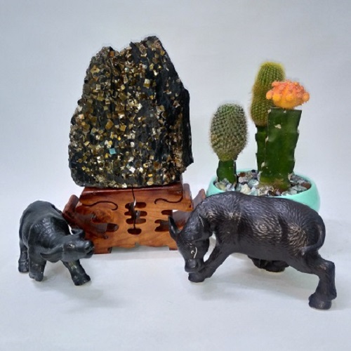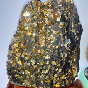 Đá Phong thủy vàng găm Pyrite là viên đá tự nhiên có những tinh thể hình lập phương giống như vàng gim cứng vào bề mặt đá chủ. Những tinh thể này sẽ chiếu sáng lấp lành dưới ánh đèn hoặc ánh sáng mặt trời. Đế được làm bằng gỗ tự nhiên lộng hoa văn và được sơn phủ bóng. Không bị mối mọt, ẩm mốc.