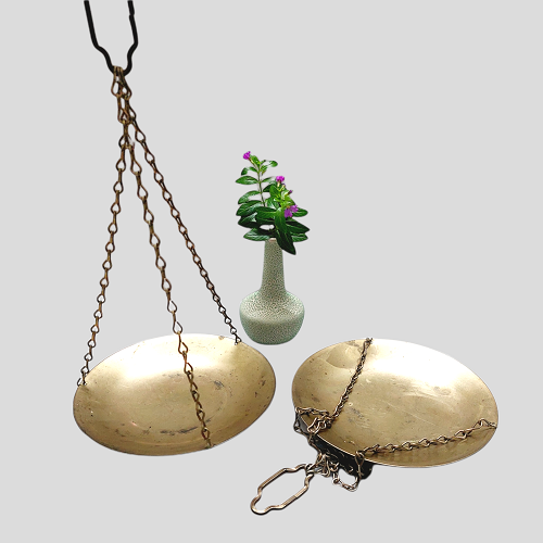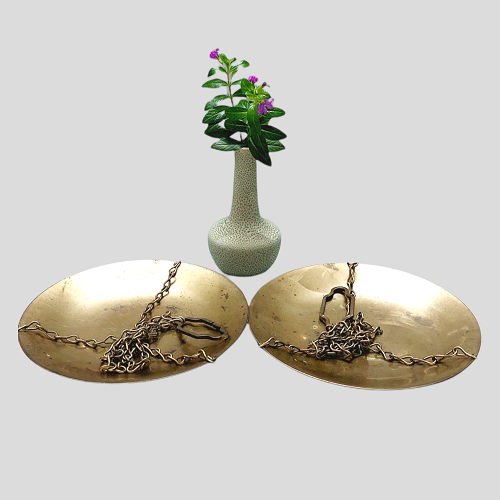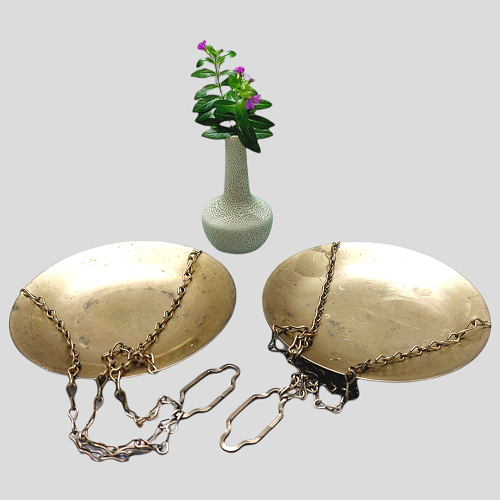 Dĩa cân bằng đồng thao xưa DC001. Sản phẩm là 2 dĩa cân có gắn dây xích treo bằng đồng thao, màu vàng đồng. Ngoại dạng còn mới theo thời gian, không móp méo như hình.