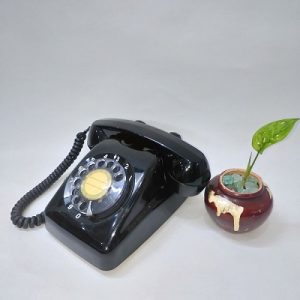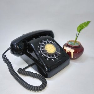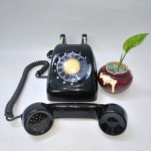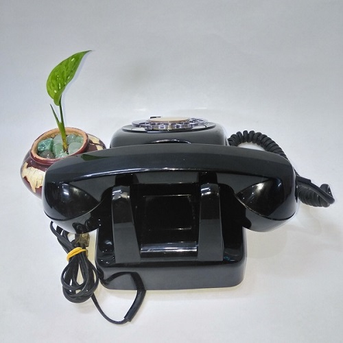 Điện thoại bàn quay số xưa (MS: DTB001). Sản phẩm là một chiếc điện thoại để bàn, màu đen, số màu trắng, quay số bằng tay.