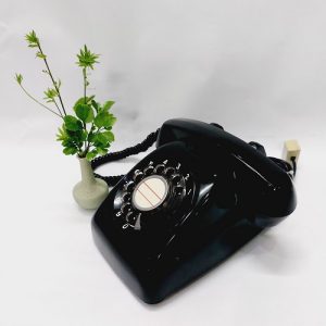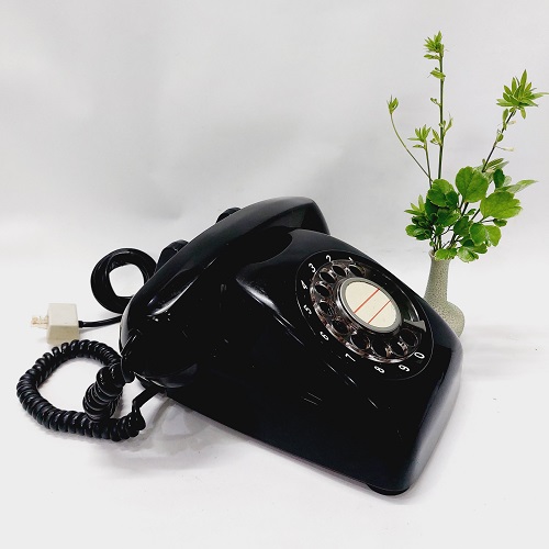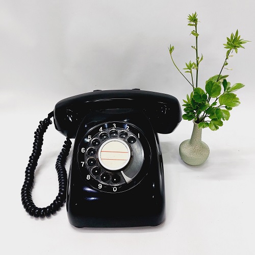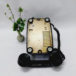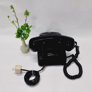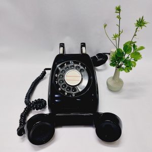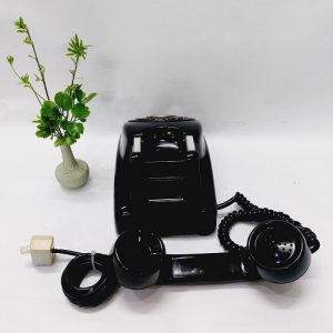 Điện thoại quay số cổ xưa DTB007. Sản phẩm là một chiếc điện thoại để bàn, màu đen, số màu trắng, quay số bằng tay.