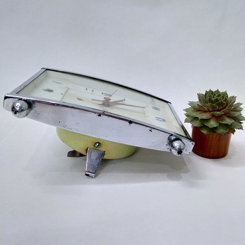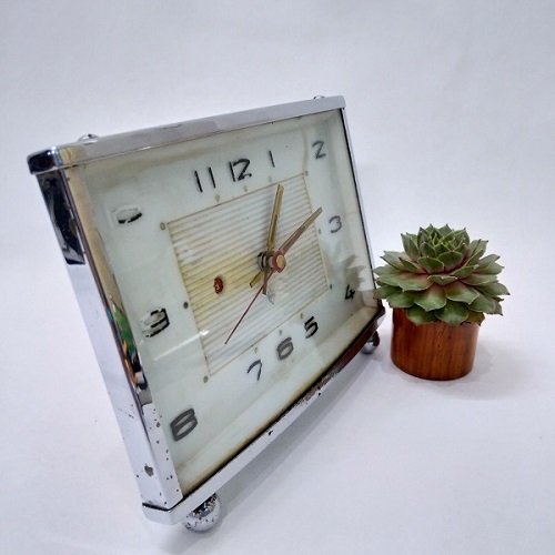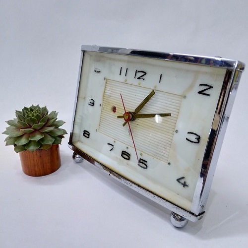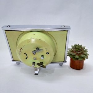 Đồng hồ có chức năng hẹn giờ báo thức, hoạt động với cơ chế lên dây cót. Vỏ bằng kim loại sơn tĩnh điện màu xanh môn. Viền và chân đế được xi mạ sáng bóng, kính mo bằng thủy tinh. Máy bên trong bằng đồng. Mặt sau thì các núm vặn còn đầy đủ.