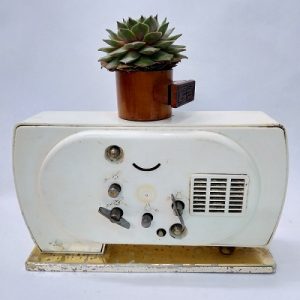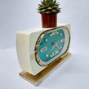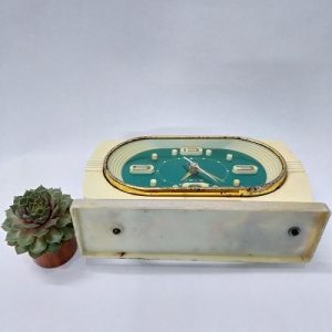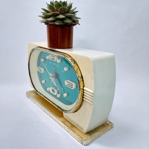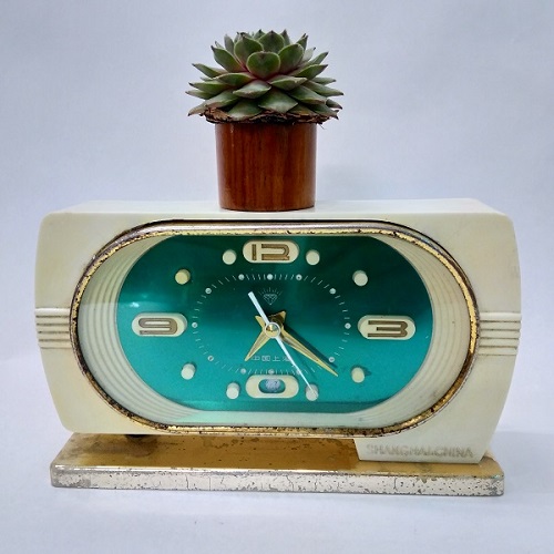 Đồng hồ có chức năng hẹn giờ báo thức, hoạt động với cơ chế lên dây cót. Vỏ và chân đế bằng nhựa màu trắng. Viền được xi mạ màu vàng, kính phẳng bằng thủy tinh. Máy bên trong bằng đồng, Mặt sau thì các núm vặn còn đầy đủ.
