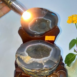 Hốc tụ bảo đá mã não phong thủy là một viên đá tự nhiên được cắt ra thành 2 nửa theo tỷ lệ 30/70. Nửa nhỏ là nắp, nửa lớn làm tụ bảo. Bên trong rỗng, là ổ thạch anh kim sa lấp lánh như ngàn vì sao.