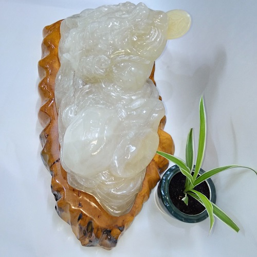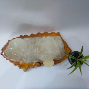 Sản phẩm là một khối ngọc. Nghệ nhân tạc thành hình Linh vật phong thủy là Thiềm thừ hay cóc ba chân. Thỏi vàng và quả đào bên cạnh. Tất cả được đặt trên một đế gỗ chắc chắn, được sơn phủ bóng, không mối mọt, ẩm mốc.