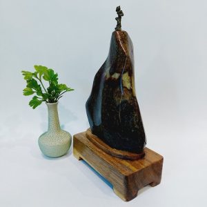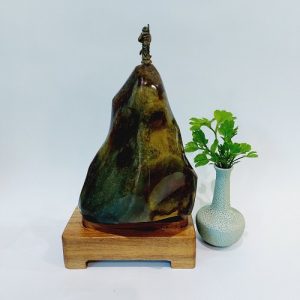 Sản phẩm là một viên đá mã não màu đỏ vàng tự nhiên. Có dáng đẹp, thấu quang mạnh. Nó được đặt trên một đế gỗ tự nhiên không bị mối mọt, ẩm mốc.