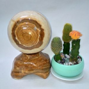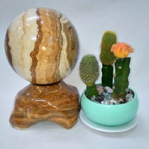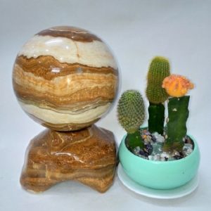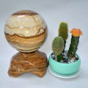 Quả cầu đá phong thủy Canxit có hình cầu, đặt trên đế được lảm bằng đá cùng loại. Nó có thể xoay tròn được và rất chắc chắn. Quả cầu Canxit có vân màu vàng, đỏ, trắng nên sản phẩm này hợp với người có mệnh Hỏa, Thổ và Kim.