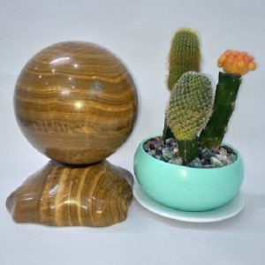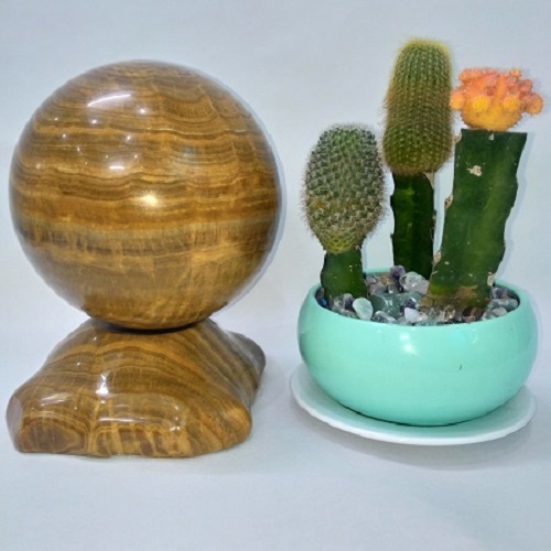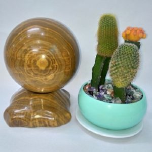 Quả cầu đá phong thủy vân gỗ có hình cầu, đặt trên đế được lảm bằng đá cùng loại. Nó có thể xoay tròn được và rất chắc chắn. Quả cầu Canxit có màu vàng vân gỗ nên sản phẩm này hợp với người có mệnh Thổ và Kim (Hoặc Hỏa).