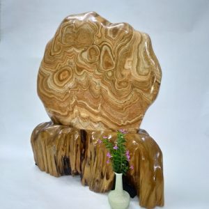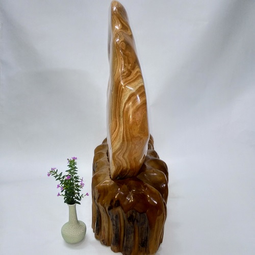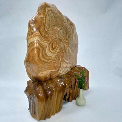 Đá đặt trên đế gỗ lũa tự nhiên, đế gỗ được sơn phủ bóng, không bị mối mọt, ẩm mốc.