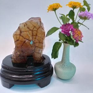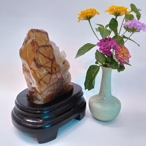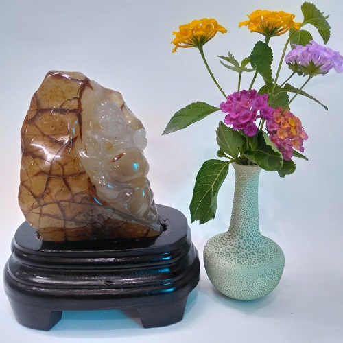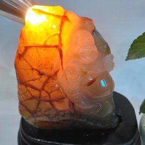 Tượng di lặc đá phong thủy mã não được giữ nguyên hình dáng nguyên thủy của viên đá, lớp da bên ngoài có màu vàng phèn, bên trong ngọc thấu quang cực mạnh.
